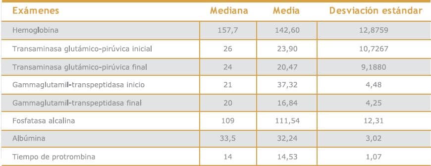 En la tabla se muestran los valores medios, las medianas y las desviaciones estándares de los exámenes complementarios realizados. Las cifras de hemoglobina de estos pacientes tuvieron medias de 142,60, con mediana de 157,37 y una desviación estándar de 12,87, iguales a las cifras de pacientes saludables.