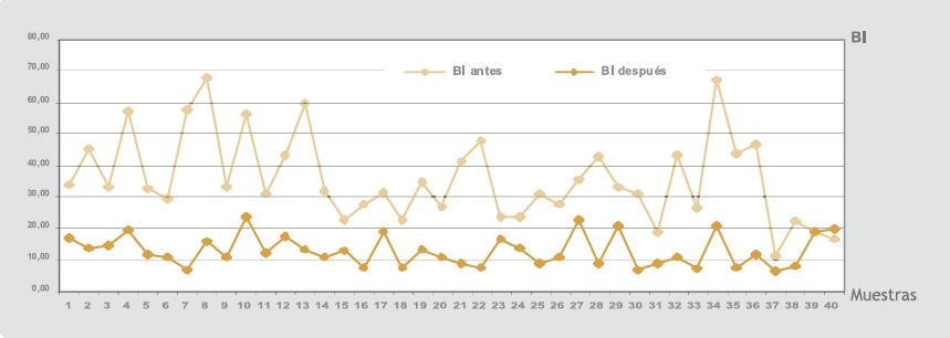 Figura 4. Cifras de bilirrubina indirecta antes y después del tratamiento.