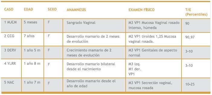 El motivo de la consulta fue el desarrollo mamario en cuatro casos y sangrado vaginal en un caso. Los principales datos clínicos y del examen físico se presentan en la Tabla 1. Una de las características en este examen inicial fue que la edad ósea no mostró diferencia significativa en relación a la edad cronológica en 4 pacientes, no teniéndose este dato en un caso. La evaluación ecográfica mostró evidencia de desarrollo de los genitales internos en todos los casos, ya sea por la presencia de imágenes foliculares, así como por el incremento en el tamaño del útero y la presencia de línea endometrial (Tabla 2). La prueba de GnRH mostró elevación de la LH a niveles puberales (Tabla 3).