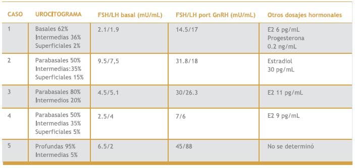 Una de las características que llama la atención en este tipo de patología es que la edad ósea no se encuentra adelantada en relación a la edad cronológica y que la velocidad de crecimiento y la talla son normales; este hecho probablemente revele una menor intensidad de la acción del proceso puberal y el relativo corto tiempo transcurrido desde el inicio del proceso hasta el diagnóstico; Della Manna y et al. (10) indican que las pacientes con PP presentan talla grande, aceleración de la velocidad de crecimiento y adelanto de la edad ósea, no así las pacientes con telarquia prematura. Un dato que no guarda relación con los datos clínicos y ecográficos de influencia estrogénica son los niveles bajos de estrógenos que presentan estas pacientes y el urocitograma. Este último examen no mostró el patrón de predominio de células superficiales propias de la acción de dicha hormona.