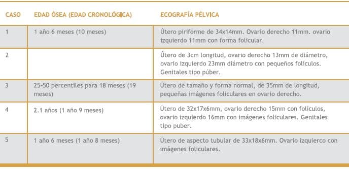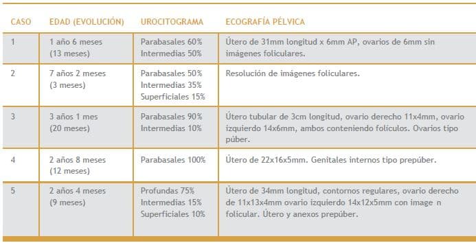 Los hallazgos físicos de desarrollo sexual secundario remitieron en todos los casos, en un período promedio de 11,4 meses (rango: 3 a 20 meses); además, en todas ellas se pudo demostrar a través de los estudios ecográficos la involución del desarrollo de genitales internos (Tabla 4).