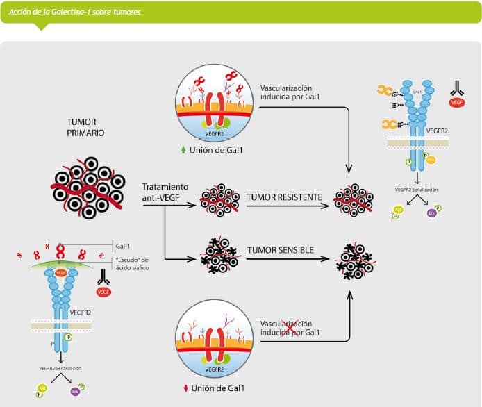 En un estudio siguiente hicieron el blanco perfecto: encontraron que la Galectina-1 se unía al mismo receptor que el VEFG, o sea que mimetizaba la acción de este. En resumen: la hipoxia resultante de la disminución de la vascularización generaría un aumento de la producción de Galectina-1, que al unirse al receptor de VEGF tipo 2 (VEGFR2) regeneraría la angiogénesis y dejaría al tumor haciendo de las suyas.