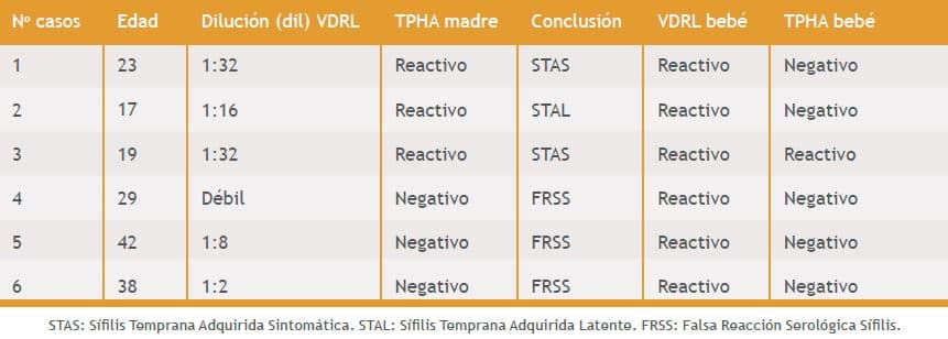 En el bebé nacido de la gestante del tercer caso fue tratado al nacer según el protocolo, pero queda la duda de estar frente una transferencia pasiva de anticuerpos de la madre al bebé o de una sífilis intraútero tratada, pues la presencia del TPHA reactivo en el bebé, tiende a confundir. Se está claro que no se trató de una sífilis congénita pues los valores de VDRL fueron siempre diluciones inferiores al de la madre. Es importante que el equipo de ITS valore cada gestante en todo su seguimiento hasta el parto, utilizando las pruebas que necesite para ello; luego al parto reevaluar el caso y debe seguir al RN al mes, a los tres meses, y concluir el caso a los seis meses a través de serologías VDRL.