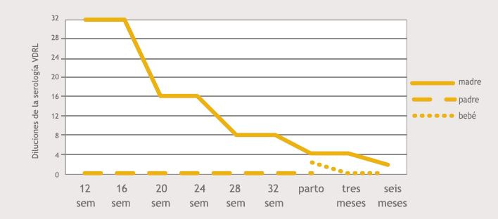 Se trata de una gestante de 16 años de edad, ama de casa, de procedencia rural con antecedentes de salud, tiempo gestacional de 12 sem. Es traída por la enfermera encuestadora por serología reactiva a la captación (dil1:16). Al interrogatorio niega síntomas y signos relacionados con la sífilis.
