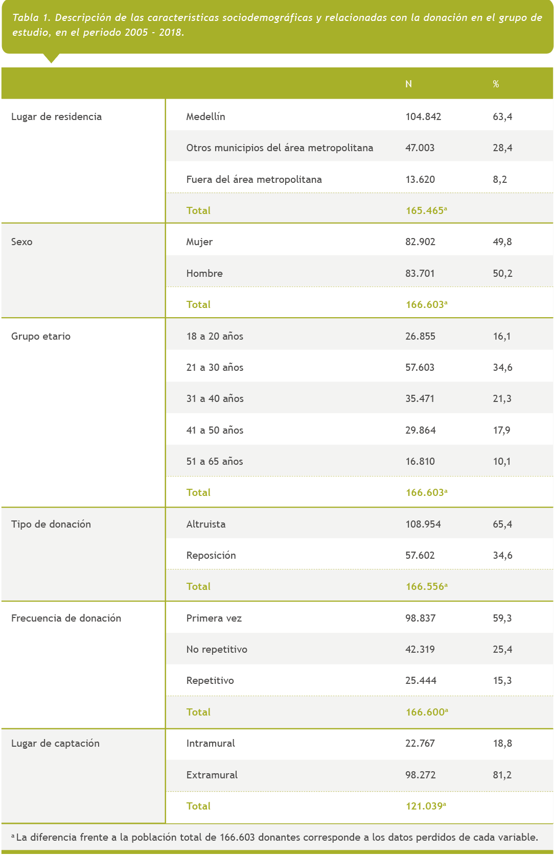 De la base de datos del banco de sangre se extrajeron las variables de lugar de residencia (agrupada en: Medellín, otros municipios del área metropolitana y municipios que no pertenecen al área metropolitana), sexo, grupo de edad, tipo de donación (altruista o por reposición), frecuencia de donación (primera vez, no repetitivo, repetitivo) y lugar de captación (intramural o extramural).