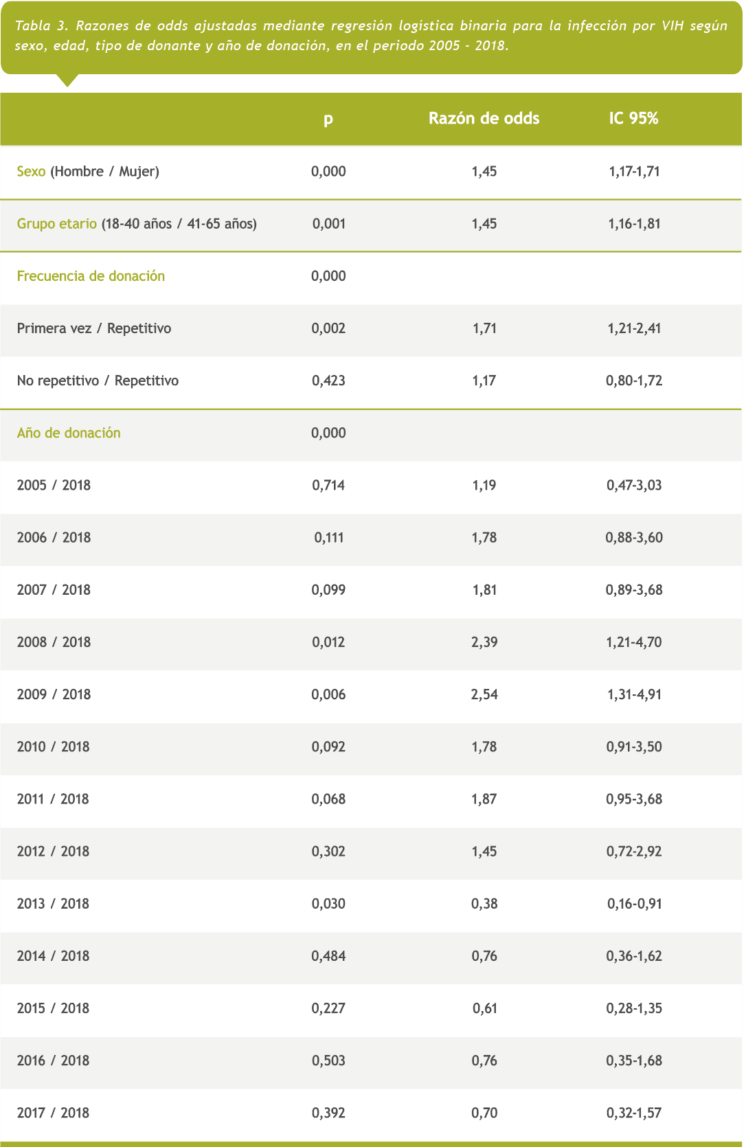 Análisis de la información: la descripción de la edad se hizo con medidas de resumen, es decir, media con desviación estándar y mediana con el rango intercuartil; las demás con frecuencias absolutas (número de donantes en cada categoría) y relativas (porcentaje). Se determinó la seropositividad de infección con su intervalo de confianza del 95% y se comparó con el lugar de residencia, el sexo, el tipo de donación y el lugar de captación con la prueba Chi cuadrado de Pearson. También se comparó con el grupo etario, la frecuencia de donación y el año de estudio con la Chi cuadrado de tendencia. Se realizó un modelo de ajuste multivariado mediante regresión logística binaria, para el control de factores de confusión. Los análisis se realizaron en SPSS 25.0® con significación del 0,05.