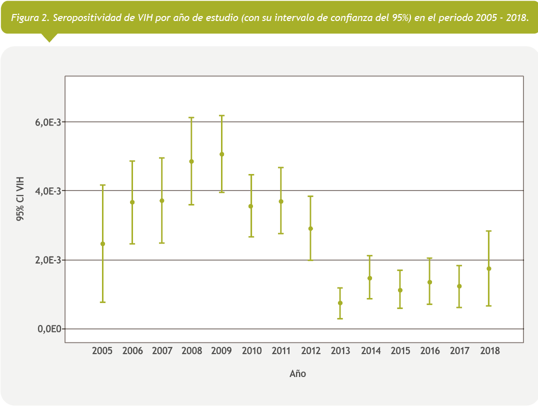 A esto se suma el mejoramiento de los programas de tamización con la incorporación de detección de cuarta generación basada en quimioluminiscencia. En tal sentido, se debe tener presente que las pruebas de detección de tercera y cuarta generación incluyen la medición de anticuerpos tipo IgG e IgM, pero las de cuarta generación, además, permiten la determinación de la proteína p-24, que aparece antes que los anticuerpos IgM, con lo cual se reduce el riesgo de resultados falsos negativos (Jaramillo, 2012). No obstante, en términos de la seropositividad hallada en este estudio, la aplicación de dichas pruebas no implica cambios significativos en las estimaciones expuestas.