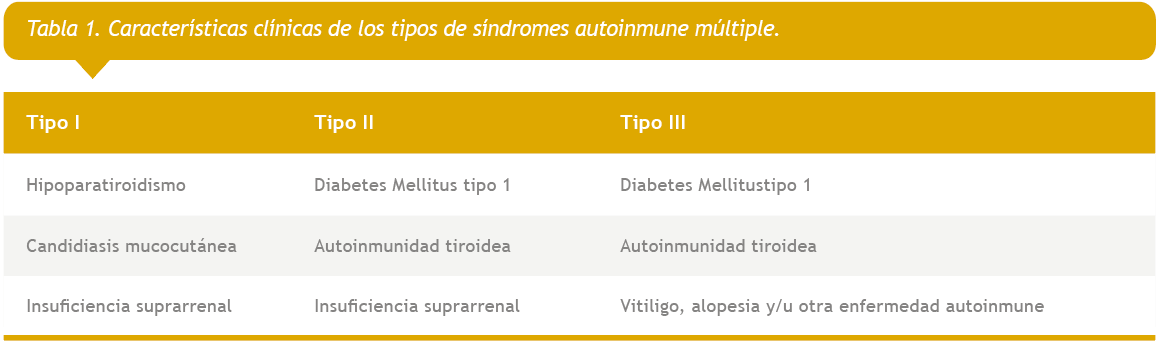 Los pacientes con Diabetes Tipo 1 presentan un mayor riesgo de otros trastornos autoinmunes, como la enfermedad tiroidea autoinmune, la enfermedad de Addison, la gastritis autoinmune, la enfermedad celíaca y el vitiligo.6 Se han descrito tipo de síndrome autoinmune múltiple, El tipo I se presenta con hipoparatiroidismo, candidiasis mucocutánea y enfermedad de Addison. Es causada por una mutación del gen regulador autoinmune (AIRE). Tipo II se presenta con la enfermedad de Addison, diabetes tipo 1 o enfermedad tiroidea autoinmune. Se han implicado múltiples genes, incluidos los del complejo principal de histocompatibilidad de clase II y el tipo III se caracteriza por enfermedad tiroidea autoinmune y otras enfermedades autoinmunes, excluyendo la enfermedad de Addison y el hipoparatiroidismo (Tabla 1).7 A su vez el síndrome autoinmune múltiple tipo 3 se subdivide en tipo IIIa si el otro trastorno autoinmune es diabetes mellitus insulinodependiente, Tipo IIIb implica anemia perniciosa, y el tipo IIIc incluye vitiligo, alopecia y/u otra enfermedad autoinmune específica de órganos.8