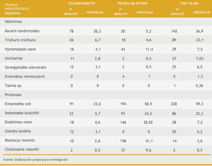 Results: Áscaris lumbricoides 142 (36.9%) and Trichuris trichura 89 (23.1%) were the most frequently observed parasites among Helminths. Entamoeba coli 228 (59.3%) and Iodomoeba butsclii 86 (22.3%) were more frequently observed among Protozoa. The «Spontaneous sedimentation in tube technique – 45 min (TSET) detected polyparasitism and monoparasitism similar to Modified Ritchie Concentration Technique (MRCT). Polyparasite samples displayed a higher frecuency of Entamoeba histolytica and Giardia lamblia parasites, and among Helminths it was found two cases of Ascaris lumbricoides and one of Himenolepys nana.