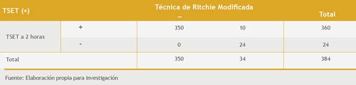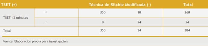 La TSET a los 45 minutos de lectura, presentó una sensibilidad del 100 %, tomando en cuenta como método de referencia la Técnica de Ritchie Modificada. Existe una muy buena correlación entre ambas técnicas Kappa = 0.82 (p< 0,01). Tabla II.