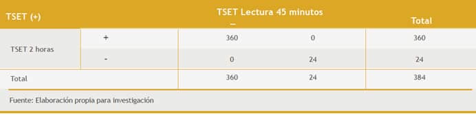 La TSET a las 2 horas de lectura presentó una sensibilidad del 100 %, tomando en cuenta a la Técnica de Ritchie Modificada, existiendo una buena correlación entre ambas técnicas Kappa = 0.82 ( p< 0,01). Tabla III.