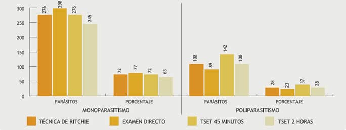 En cuanto a la capacidad de detección de poli parasitismo se observa que la TSET a los 45 minutos y la Técnica de Ritchie tienen un porcentaje de detección mayor a la observación directa (28%) y (23%) respectivamente y aun la TSET tiene un porcentaje de detección mayor (37%) a las 2 horas, lo que nos indicaría, que a mayor tiempo de sedimentación mayor será la capacidad de detectar más de una especie de parásitos.