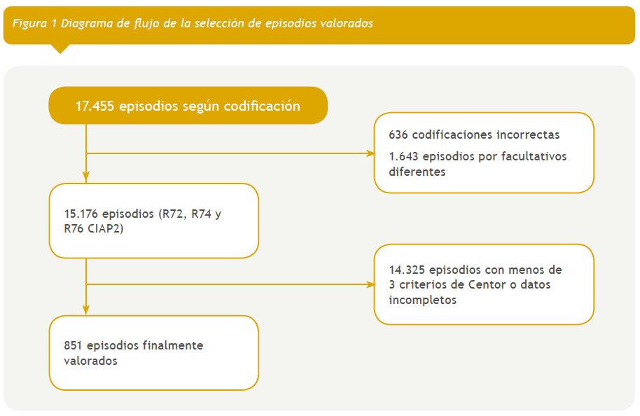 Se recogió información en los diez cupos de los episodios de FA que cumplían 3-4 criterios de Centor durante los años 2012 y 2013. La escala de Centor15 puntúa de 0 a 4 según la presencia de los siguientes criterios: fiebre > 38 °C, exudado amigdalar, adenopatías subangulomandibulares protuyentes y ausencia de tos. El programa de historia clínica informatizada disponible (OMI-AP(r)) codifica los diagnósticos asociados al episodio en función de la Clasificación Internacional de Atención Primaria (CIAP2)20. Se revisaron todos los diagnósticos atendidos por el pediatra titular de cada grupo de pacientes asignados (faringitis/faringoamigdalitis, amigdalitis, infección respiratoria tracto superior; códigos CIAP2 R72, R76 y R74, respectivamente). Se incluyeron para el análisis posterior los episodios de estos diagnósticos que cumplieran tres o cuatro criterios de Centor, que hubieran sido abordados por el pediatra titular de ese cupo y que no pertenecieran a pacientes con alguna patología de base o tratamiento inmunosupresor que condicionase un manejo diferente de la FA. Quedaron excluidos los episodios en los que se justificó la no realización de test diagnóstico (imposibilidad de toma de muestra, tratamiento antibiótico reciente y cardiopatía). Asimismo, se recogieron los diagnósticos registrados en el mes siguiente, que pudieran ser considerados como complicación infecciosa por la ausencia de tratamiento, y los potencialmente secundarios al tratamiento.