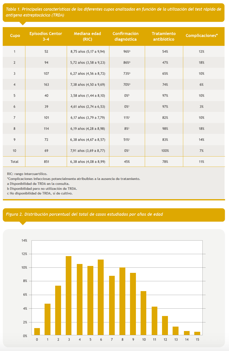 Tras la revisión de 17455 episodios correspondientes a las codificaciones antes descritas en los diez cupos, 851 episodios cumplieron los criterios válidos para el análisis (Fig. 1). Las aportaciones de episodios de cada uno de los cupos oscilaron desde 39 hasta 163. En uno de los cupos, el pediatra disponía de TRDA pero no lo utilizaba. En total, los centros que utilizaban TRDA aportaron 435 casos, y los que no 416 (Tabla 1).