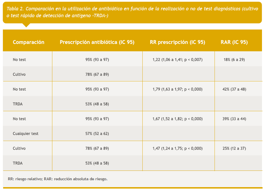 Resultados: de 17455 episodios registrados, se seleccionaron 851 que cumplían los criterios de inclusión (tres o cuatro criterios de Centor). En los episodios en los que se realizaron test rápidos de detección de antígeno, la reducción en la prescripción antibiótica fue del 42% (reducción absoluta de riesgo: 42%; intervalo de confianza del 95% [IC 95]: 37 a 48; p < 0,001). Comparando el abordaje entre los pediatras que disponían y utilizaban el test (4), con los que no (6), la reducción absoluta de riesgo fue del 29% (IC 95: 24 a 34; p < 0,001). Se presentaron complicaciones infecciosas en el 12% de los tratados y en el 8% de los no tratados (riesgo relativo: 1,49; IC 95: 0,88 a 2,52; p = 0,178). Se prescribió significativamente más penicilina V que amoxicilina cuando se realizó test diagnóstico (riesgo relativo: 1,30; IC 95: 1,10 a 1,55; p = 0,004).