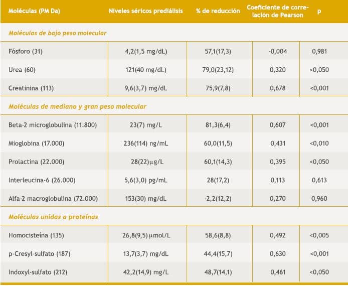 La tabla 2 muestra el porcentaje de reducción de las moléculas en la sesión de diálisis y su correlación con el transporte convectivo.