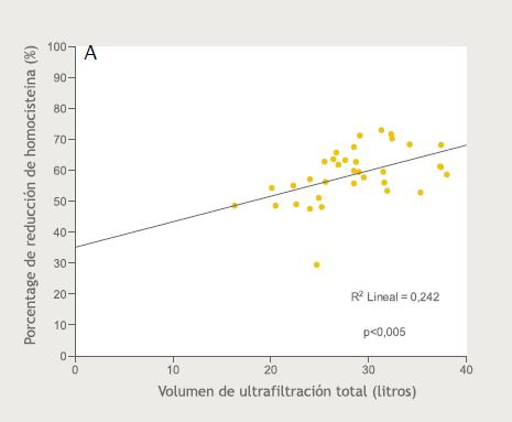 Resultados: El volumen convectivo total fue de 28,3(5,1) litros con un rango entre 16,3 y 38,0 litros. La reducción media de moléculas unidas a proteínas fue de 44,4(15,7) % para el p-cresyl sulfato, de 48,7(14,1) % para el indoxyl sulfato y de 58,6(8,8) % para la homocisteína. Además, se encontró una relación directa y estadísticamente significativa entre el porcentaje de reducción de las tres moléculas con el volumen de sustitución y con el Kt/V.