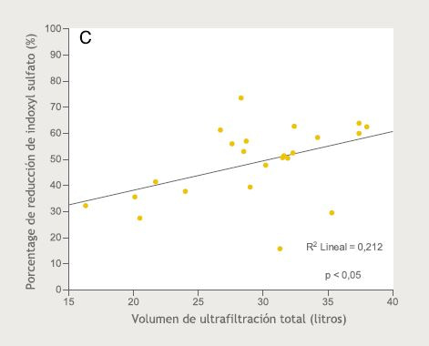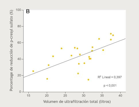 Nuestro estudio demuestra que altos volúmenes de transporte convectivo en HDF-OL se asocian a una mayor depuración de toxinas unidas a proteínas y se confirma una mayor eliminación de moléculas de pequeño y mediano tamaño, como ha sido demostrado en otros estudios.