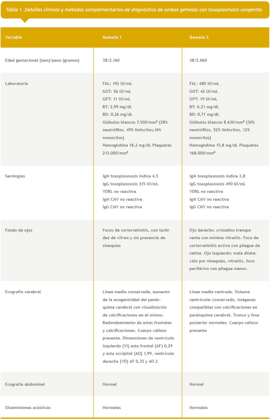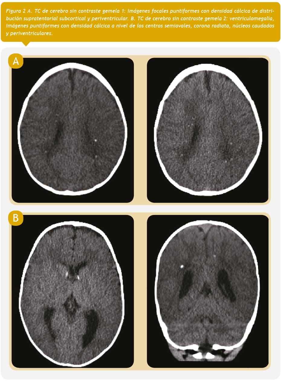 Nacieron gemelas de sexo femenino de 38 semanas de edad gestacional (Tabla 1). El examen físico al nacer fue normal. En el fondo de ojos ambas presentaron signos de coriorretinitis activa bilateral (Figura 1) y en las ecografías y TC cerebrales se detectaron calcificaciones cerebrales (Figura 2A y 2B). No se realizó RPC en sangre ni en líquido cefalorraquídeo (LCR) para toxoplasmosis. No se estudió la placenta ni la sangre de cordón umbilical. No se realizó punción lumbar para obtención de LCR debido a que el compromiso neurológico fue confirmado por la presencia de lesiones oculares y cerebrales. En base a los antecedentes maternos, resultados serológicos de ambas gemelas y hallazgos compatibles en el fondo de ojos e imágenes cerebrales, y habiéndose descartado otras infecciones que pueden producir un cuadro similar, se hizo el diagnóstico de toxoplasmosis congénita sintomática con compromiso neurológico.