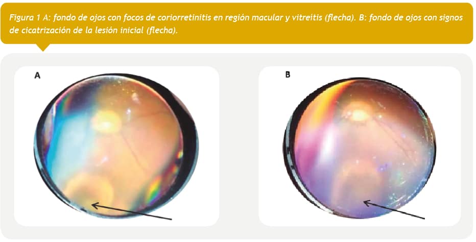 En la actualidad, han completado dos años de seguimiento multidisciplinario, recibiendo estimulación temprana con controles oftalmológicos, neurológicos, auditivos y clínicos periódicos no habiéndose detectado reactivación de lesiones oculares, ni progresión de compromiso neurológico.