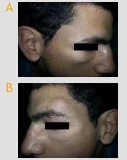 Figura 1: Fotografía del paciente donde se observan los nódulos y edema peri-orbitario derecho (A) e izquierdo (B).