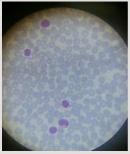 Figura 2: Frotis de sangre periférica donde se observan linfocitos típicos anormales con citoplasma agranular débilmente basófilo y núcleo lobulado, denominados “células en flor” característicos de la ATLL aguda y crónica (May-Grünwald Giemsa staining, 100X).