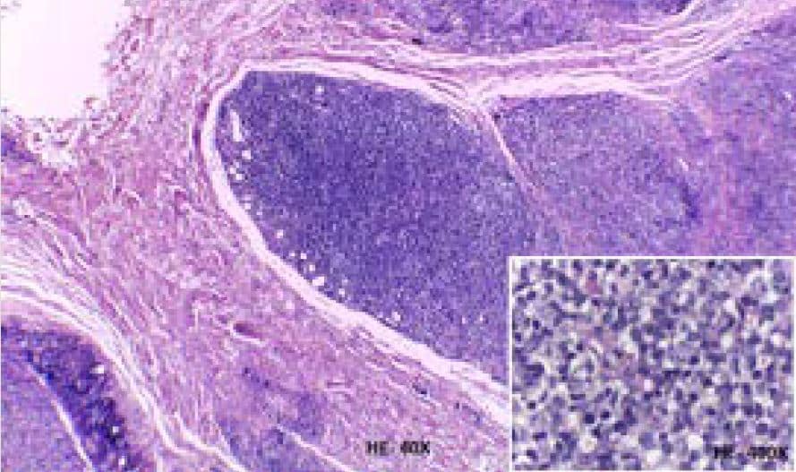 Figura 3: Histopatología de nódulo de piel de antebrazo izquierdo donde se observa tejido subepitelial infiltrado por una población predominante de