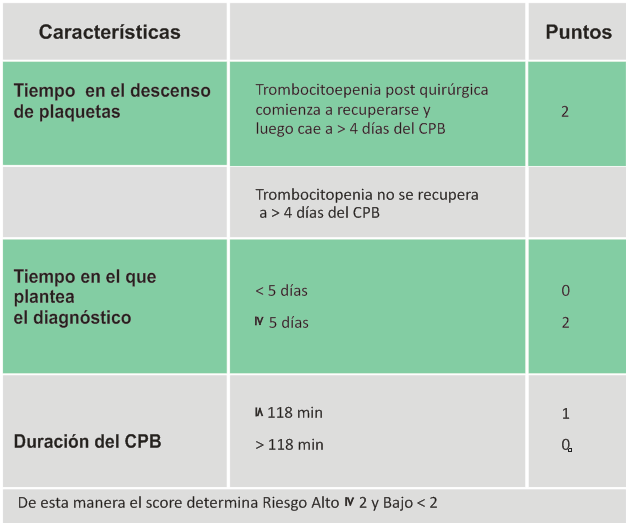 A esto se sumó un score adicional para pacientes que sufrieron una cirugía de CPB (Tabla 2), aunque no ha sido validado prospectivamente. Más recientemente, un grupo de expertos de Estados Unidos y Canadá, han desarrollado un nuevo score denominado “Hit experts probability score” o HEP-Score (Tabla 3). Mediante la utilización del mismo en un grupo de 50 pacientes consecutivos utilizando las repuestas de 26 expertos, se estableció que la concordancia entre los médicos que lo utilizaban era mayor que para el T4 Score.