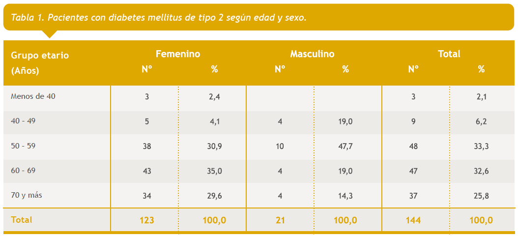Fueron excluidos de la investigación los pacientes con insuficiencia renal crónica, trasplante renal, disfunción tiroidea, virus de la inmunodeficiencia humana y neoplasias. Las variables analizadas fueron edad, sexo, índice de masa corporal, hipertensión arterial, obesidad, dislipidemia, complicaciones, filtrado glomerular calculado mediante la fórmula CKD-EPI(6,7) del software Nefrocal. Como analitos figuraron la creatinina pap, el colesterol y los triglicéridos, determinados por el método enzimático, y la cistatina C, por el método inmunoturbidimétrico. Las muestras de sangre se extrajeron de una vena del antebrazo con jeringuillas plásticas desechables, previa asepsia del área, y se colectaron en tubos de cristal para el centrifugado (sin anticoagulante), que se efectuó a 2500 revoluciones por minuto durante 10 minutos. Al suero se le determinaron los triglicéridos, el colesterol total, la creatinina y la cistatina C, los que fueron procesados de inmediato en un analizador New Inlab 240. Se empleó el calibrador comercial ONECAL 2 para los analitos y los calibradores del equipo de cistatina C, ambos específicos de la aplicación. En el procesamiento estadístico de la información se utilizó el porcentaje como medida de resumen. Resultados En la tabla 1 se evidencia que el grupo etario más frecuente fue el de 50 a 59 años, con 33,3 %, seguido de los grupos de 60 a 69 años, con 32,6%, y de 70 y más, con 25,8%. En cuanto al sexo, predominó el femenino, con 123 casos, para 85,4 %, y en este fue superior el porcentaje que comprendía las edades de 60 a 69 años (35,0).