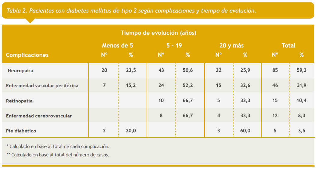 Al analizar las comorbilidades en estos pacientes, la hipertensión arterial resultó la enfermedad más frecuente, con 75,7%, a la cual le siguieron la obesidad y, en menor cuantía, la dislipidemia, con 43,8 y 22,9%, respectivamente. Entre las complicaciones predominó la neuropatía periférica, con 59,3 %, seguida de la enfermedad vascular periférica, con 31,9%, y la retinopatía, con 10,4% (tabla 2). El tiempo de evolución de la diabetes mellitus en que más aparecieron estas complicaciones osciló entre los 5 a 19 años, aunque algunas se presentaron muy tempranamente, como la neuropatía periférica, que se manifestó antes de los 5 años en 23,5%.