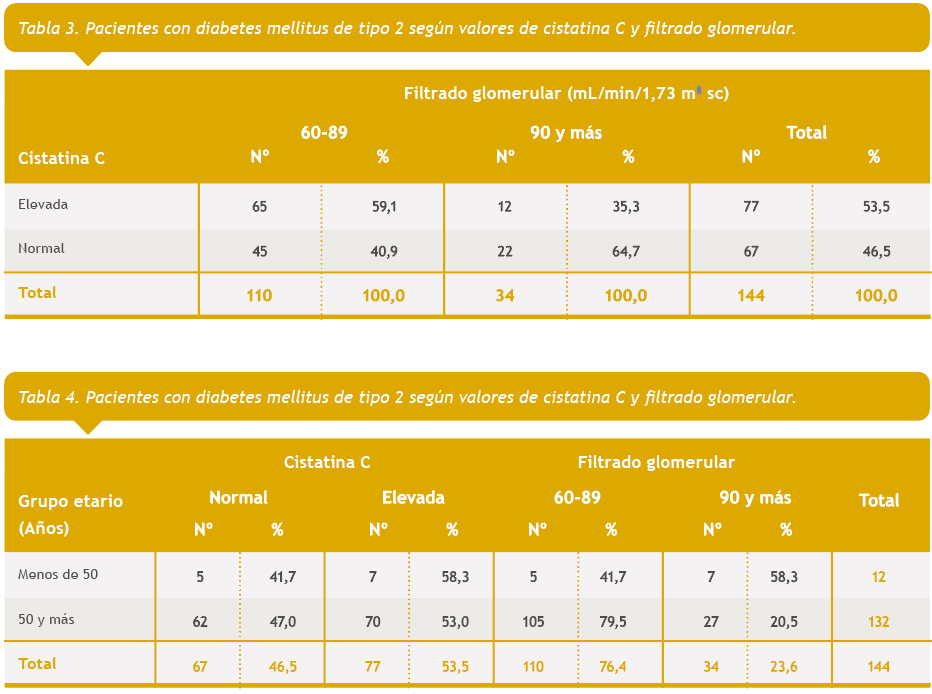 De los pacientes con 50 y más años, 53,0% presentó valores elevados de cistatina C y 79,5%, cifras entre 60-89 mL/min en 1,73 m2 de sc en el filtrado glomerular (tabla 4).
