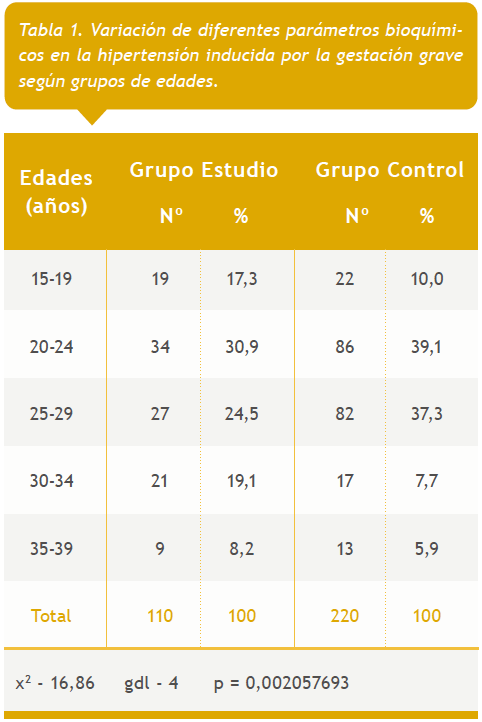 La edad de las pacientes estudiadas se muestra en la tabla 1 y, se aprecia que hubo predominio de las pacientes entre los 20 y 34 años de edad para ambos grupos (30.9% y 39.1% respectivamente). Se debe señalar que tanto el conjunto de adolescentes como de añosas prevaleció en el grupo estudio con relación al grupo control. La media fue similar para ambos grupos investigados (25,5 ± 6,0 y 25,0 ± 4,5 años respectivamente). Por otro lado, existe elevada relación entre la edad y la presencia de la hipertensión arterial inducida por el embarazo.