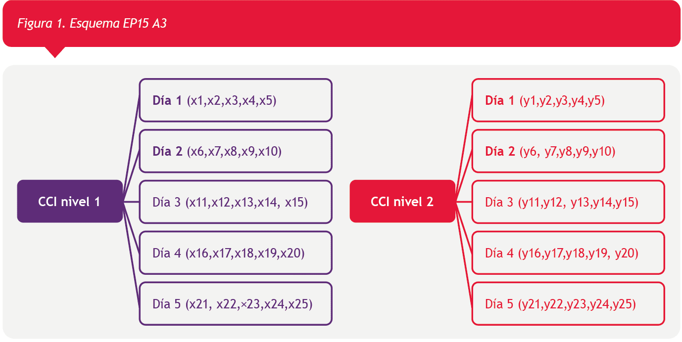 EP15A3, es un procedimiento que permite tanto la verificación de la precisión intra e inter-serie como la verificación de la veracidad, y puede ser aplicado en laboratorios de distinta complejidad, independientemente de sus recursos. Brevemente, se deben procesar al menos dos niveles de una muestra con concentraciones conocidas de los mensurandos a verificar. Estas muestras deben ser medidas por quintuplicado durante 5 días consecutivos (Figura 1). A partir de los resultados obtenidos se calculan los coeficientes de variación (CV%) intra e inter ensayo, los cuales se comparan con los declarados por el fabricante con el objetivo de verificar la precisión. En referencia a la veracidad, lo recomendado es la utilización de un material con valores asignados, cercanos a los niveles de decisión médica y a los especificados por el fabricante en los que éste determinó las especificaciones de precisión declarada. A partir de los resultados obtenidos, se los compara con los resultados del material con valor asignado a fin de obtener el sesgo, el cual tiene que ser menor al propuesto por el laboratorio donde se adquirió el equipamiento a evaluar.