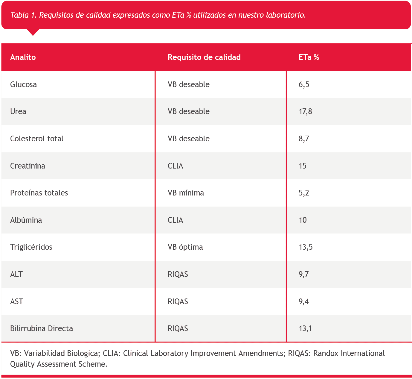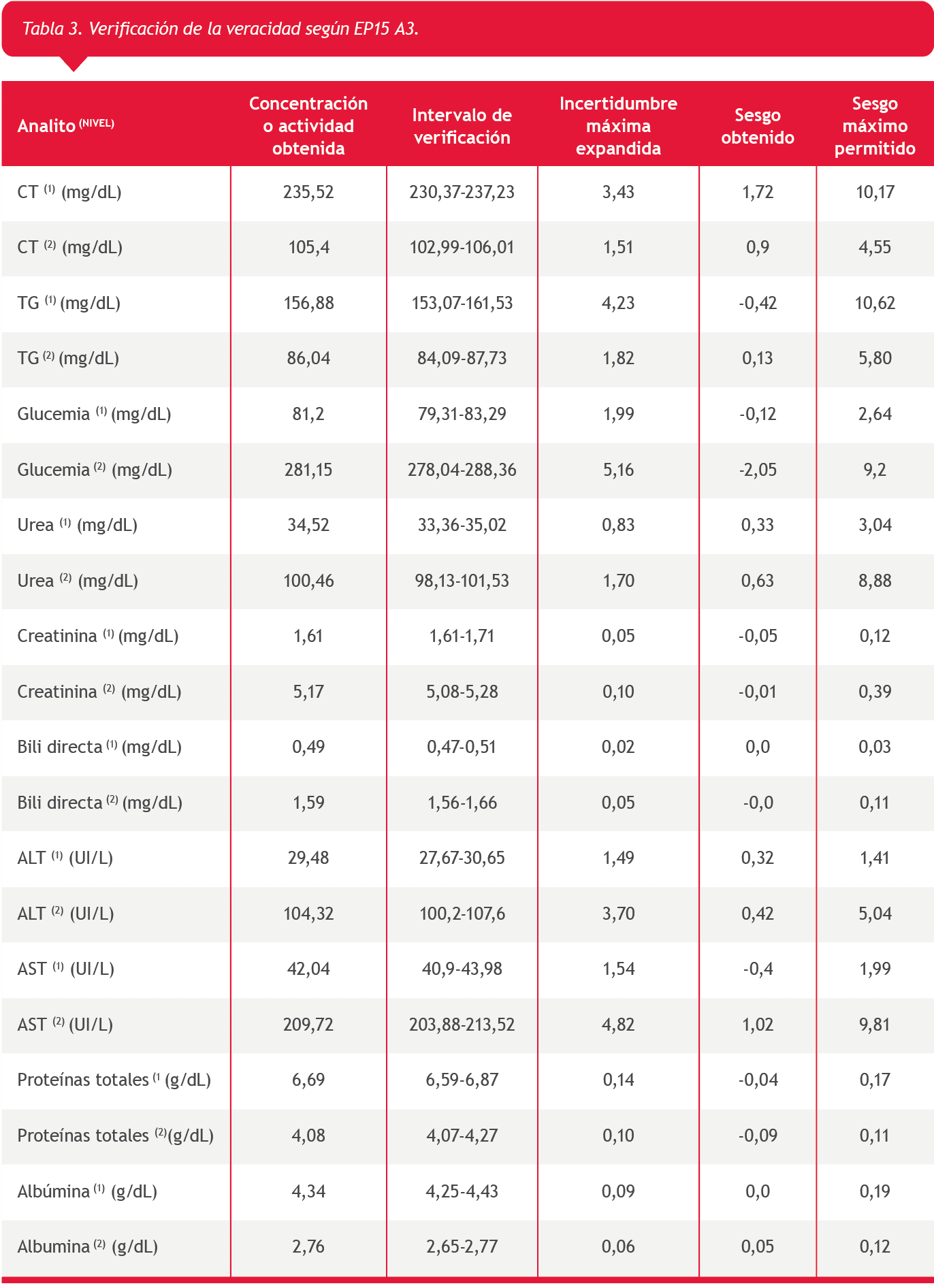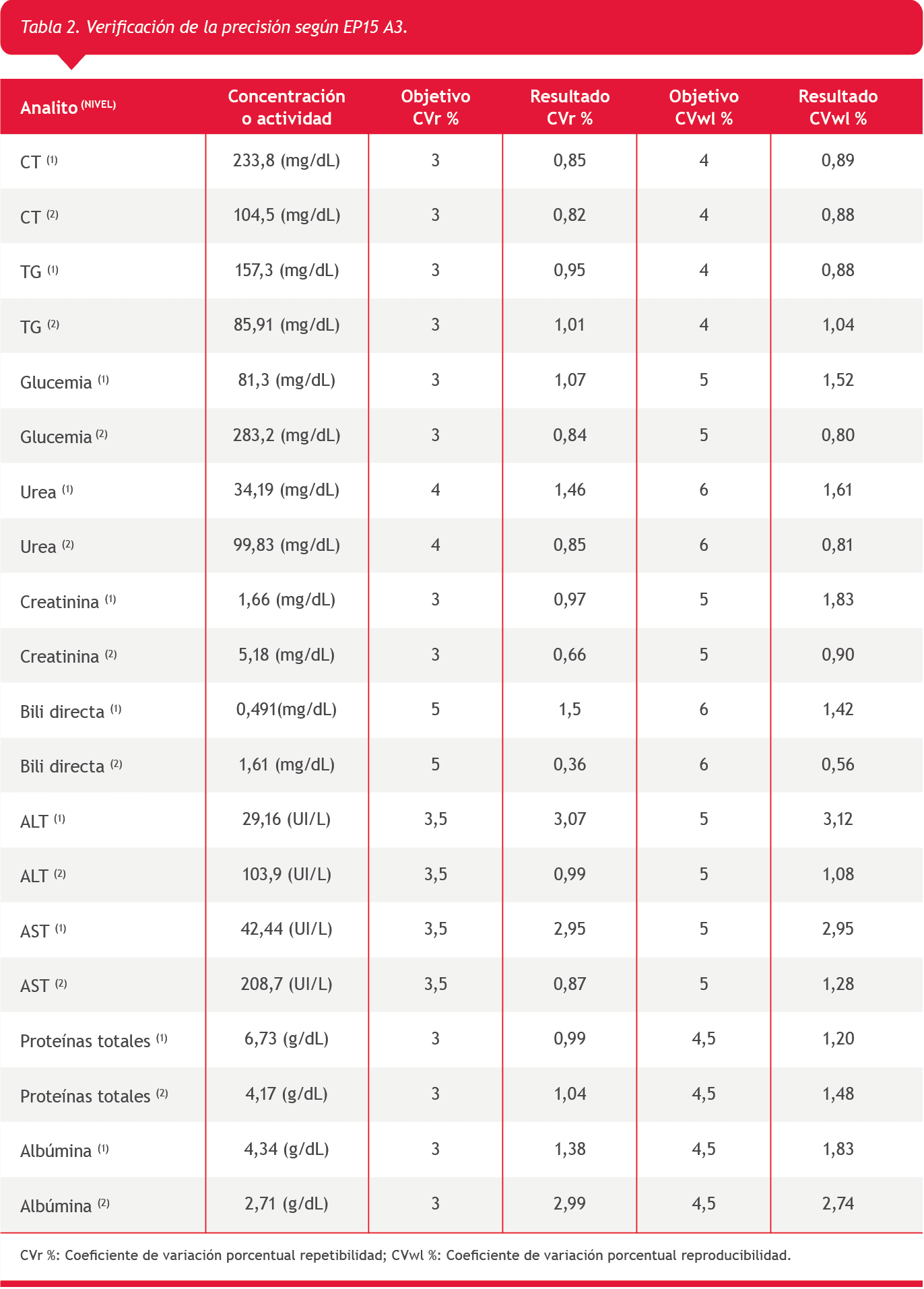 Se realizó el protocolo EP15A3 para los siguientes mensurandos utilizando dos niveles de un control de calidad de tercera opinión (Lyphochek® Assayed Chemistry Control-Biorad): albúmina (Verde de bromocresol), aspartato aminotransferasa (AST) (UV según IFCC sin activación por fosfato de piridoxal), alanina aminotransferasa (ALT) (UV según IFCC sin activación por fosfato de piridoxal), bilirrubina directa (ácido sulfanílico diazotado), colesterol total (colesterol oxidasa-peroxidasa), creatinina (sarcosina oxidasa), glucosa (glucosa oxidasa-peroxidasa), proteínas totales (Biuret), triglicéridos (glicerol quinasa- oxidasa -peroxidasa) y urea (ureasa-glutamato deshidrogenasa UV), comparando los resultados de precisión con las afirmaciones del fabricante y de veracidad con los errores totales aceptables (ETa %) utilizados en nuestro laboratorio (Tabla 1).