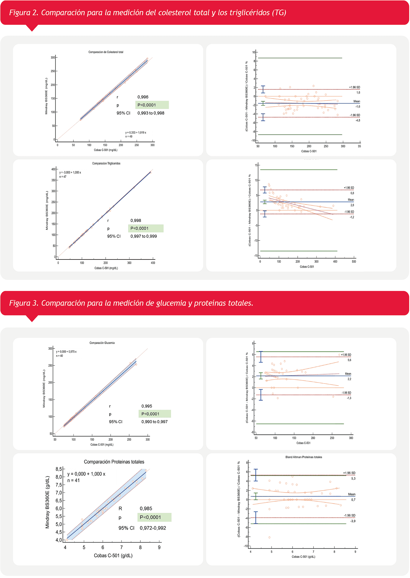 En la figura 2 se observan los resultados obtenidos en la comparación entre el Mindray BS-360E y el Cobas c-501 para la medición del colesterol total y los triglicéridos (TG). En ambos casos se observa una excelente correlación, con sesgos menores a los estipulados por nuestro laboratorio. En el caso de los TG se observa que la diferencia entre ambos autoanalizadores es dependiente de la concentración, con una tendencia a la sobreestimación de TG por el BS-360E a medida que aumenta la concentración del mismo.