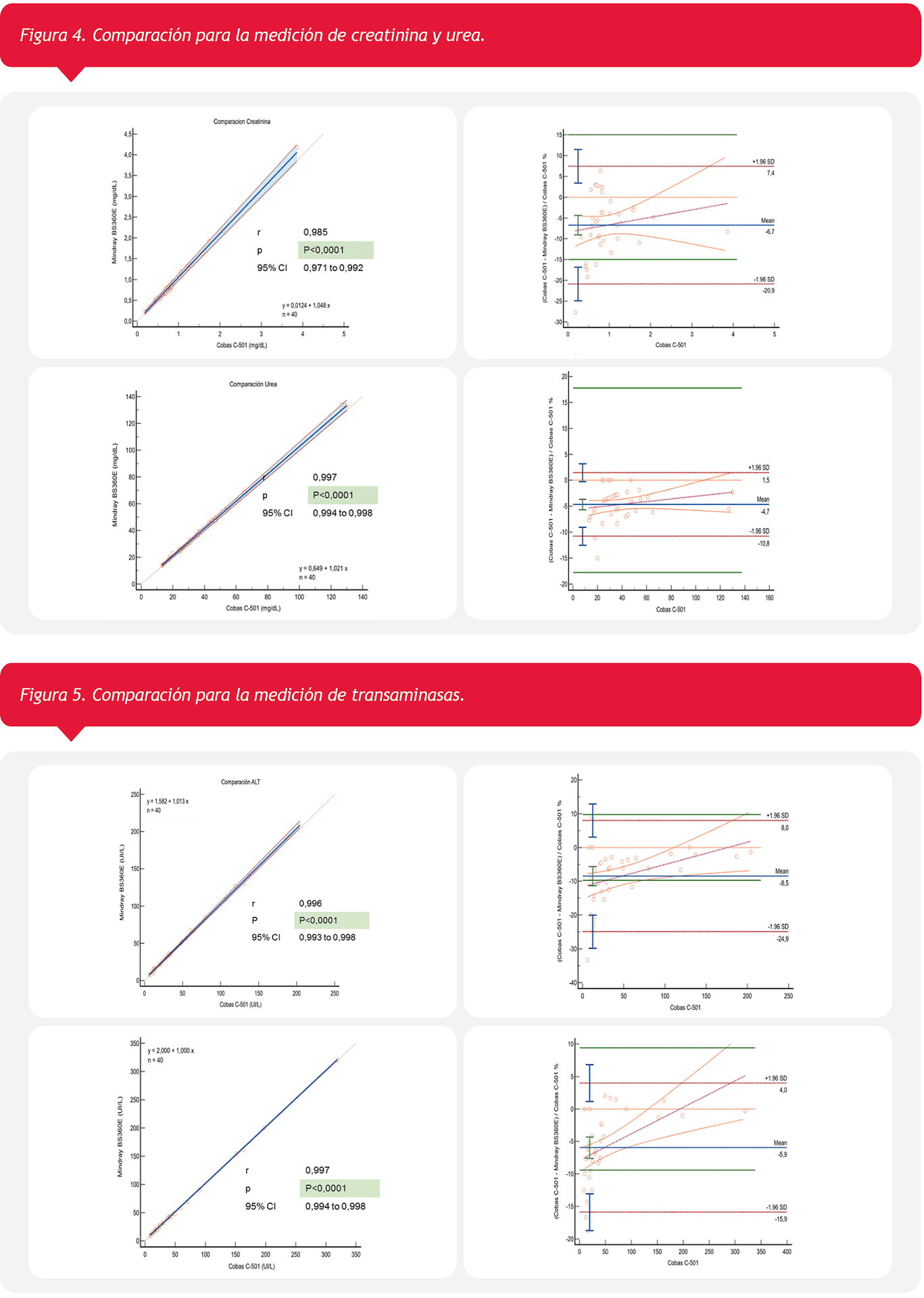 La creatinina medida en c-501 fue por la metodología Jaffe cinético, sin embargo la diferencia con el BS-360E fue menor al sesgo propuesto, si bien se observa que a medida que aumenta la concentración, la medición con este último tiende a subestimar en comparación con el c-501. Esto mismo vemos que sucede con la urea, aunque en este caso, en ambas plataformas fue medido con la misma técnica (Figura 4).