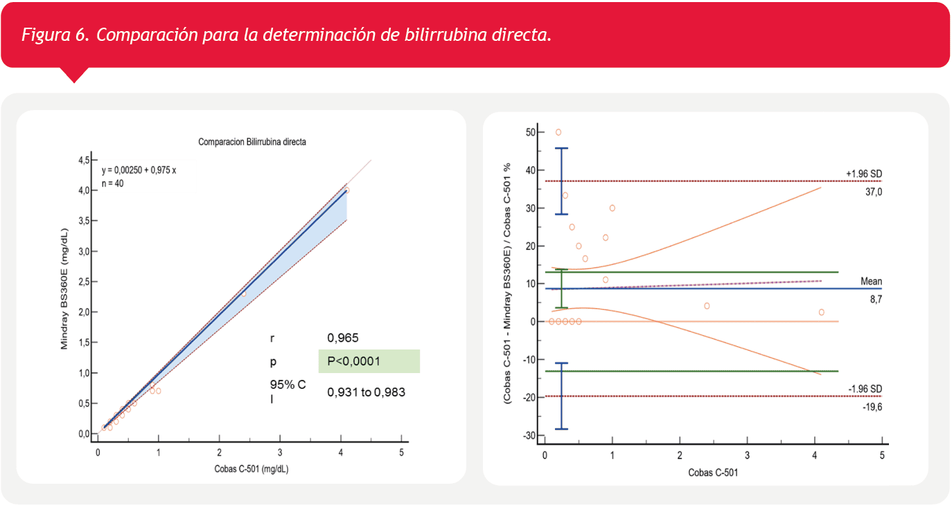 Finalmente la comparación de la bilirrubina directa, la cual se observa una tendencia a la subestimación por BS-360E en valores normales (Figura 6).