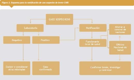 La CHIK no es una enfermedad de declaración obligatoria en la mayoría de los países. Sin embargo, dependiendo de la situación epidemiológica, cada país debe determinar en forma independiente cuando CHIK debe ser una enfermedad de declaración obligatoria. La aparición de casos sospechosos podría indicar un brote y, por lo tanto, debería ser reportada inmediatamente a las autoridades sanitarias más cercanas de acuerdo a las pautas del RSI. Antes de la introducción de la CHIK en un área, los médicos deben informar a los funcionarios locales de salud pública sobre cualquier caso sospechoso o confirmado relacionado con viajes. Estos, por su parte, deben reportarlo a nivel regional y posteriormente a nivel nacional, donde se debe resumir compartir la información con los otros interlocutores clave (Figura 3 Ver primer imagen a la derecha). Además, se debe notificar a otros interlocutores clave, tales como los equipos de manejo y control de vectores.