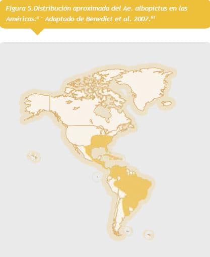 Puesto que no se dispone de una vacuna efectiva para el CHIKV, la única herramienta disponible para prevenir la infección es la reducción del contacto humano-vector. Los vectores primarios del CHIKV son Ae. aegypti y Ae. albopictus. Ae. aegypti es el vector principal en las zonas de África donde el virus se considera endémico. Sin embargo, se incriminó a Ae. Albopictus durante epidemias recientes, después de la introducción del virus en zonas templadas de Europa17 y algunas áreas tropicales del Océano Índico.27, 57 Estos brotes se asociaron con la adaptación de las cepas del CHIKV a Ae. albopictus. 58, 59 Tanto Ae. aegypti como Ae. albopictus están presentes en las Americas (Figuras 4 y 5). Ae. aegypti sería probablemente el vector más impor tantes en áreas urbanas, y Ae. albopictus jugaría, posiblemente, un rol más significativo en áreas templadas y en áreas donde está bien establecido. Ambos mosquitos podrían permitir la introducción de cepas del CHIKV en una variedad de áreas geográficas de la Región. Por lo tanto, los esfuerzos de planificación para el control de vectores deben focalizarse en la supresión de las poblaciones tanto de Ae. aegypti como de Ae. albopictus para prevenir el potencial establecimiento del CHIKV y para sentar las bases de las intervenciones de emergencia en caso de brote.
