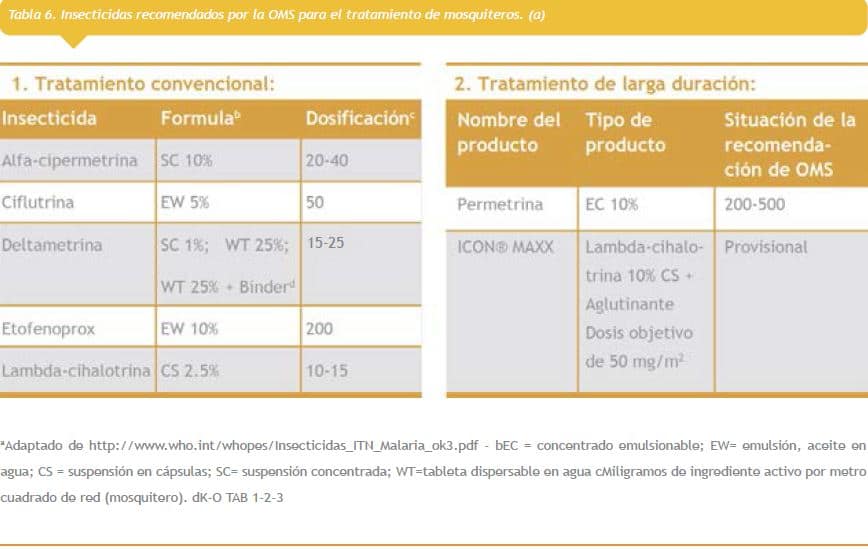 Los individuos pueden reducir el riesgo de infección mediante el uso de repelentes personales sobre la piel o la ropa. DEET (N,N-dietil-m-toluamida) y picaridin (también conocido como KBR3023 o Bayrepel™) son repelentes efectivos ampliamente disponibles en las Américas. Los niños pequeños y otras personas que duermen o descansan durante el día deben usar mosquiteros para evitar la infección transmitida por Ae. aegypti y Ae. albopictus, ya que ambos mosquitos pican durante el día. Es de particular importancia durante un brote que los individuos potencialmente infectados con CHIKV descansen bajo la protección de un mosquitero TI para evitar las picaduras del mosquito y la posterior diseminación de la infección. El uso de mosquiteros TI tiene el beneficio adicional de matar a los mosquitos que entran en contacto con el mosquitero, lo que puede reducir el contacto vector-humano para otros habitantes de la vivienda.72 Se pueden utilizar varios pesticidas para tratar los mosquiteros en forma segura (Tabla 6), o se pueden obtener en el mercado mosquiteros pretratados de larga duración.