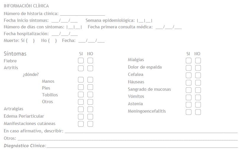 Caso sospechoso: paciente con fiebre >38,5ºC (101,3ºF) y artralgia severa o artritis de comienzo agudo, que no se explican por otras condiciones médicas, y que reside o ha visitado áreas epidémicas o endémicas durante las dos semanas anteriores al inicio de los síntomas.