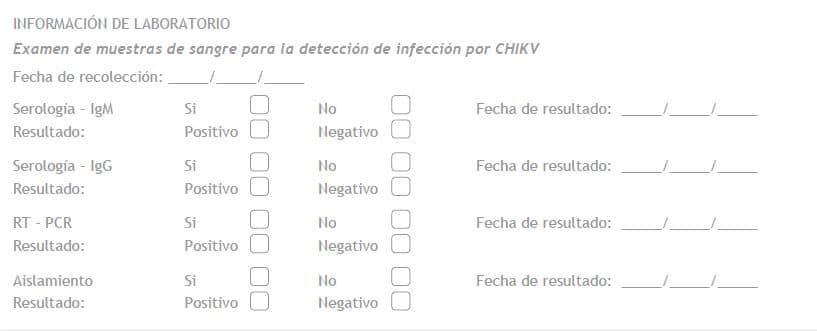 - Aumento de cuatro veces en el título de anticuerpos específicos para CHIKV (muestras recogidas con al menos dos a tres semanas de diferencia).